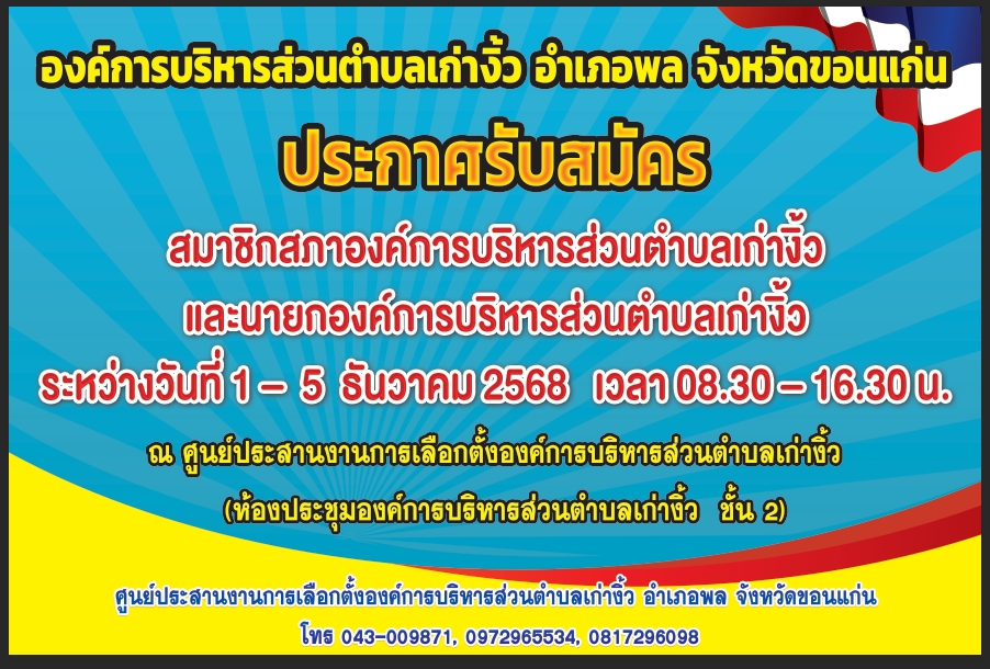 ประกาศรับสมมัครสมาชิกสภาองค์การบริหารส่วนตำบลเก่างิ้วและนายกองค์การบริหารส่วนตำบลเก่างิ้วระหว่างวันที่ ๑ - ๕ ธันวาคม ๒๕๖๘ เวลา ๐๘.๓๐ - ๑๖.๓๐ น.ณ ห้องประชุมองค์การบริหารส่วนตำบลเก่างิ้ว ชั้น ๒